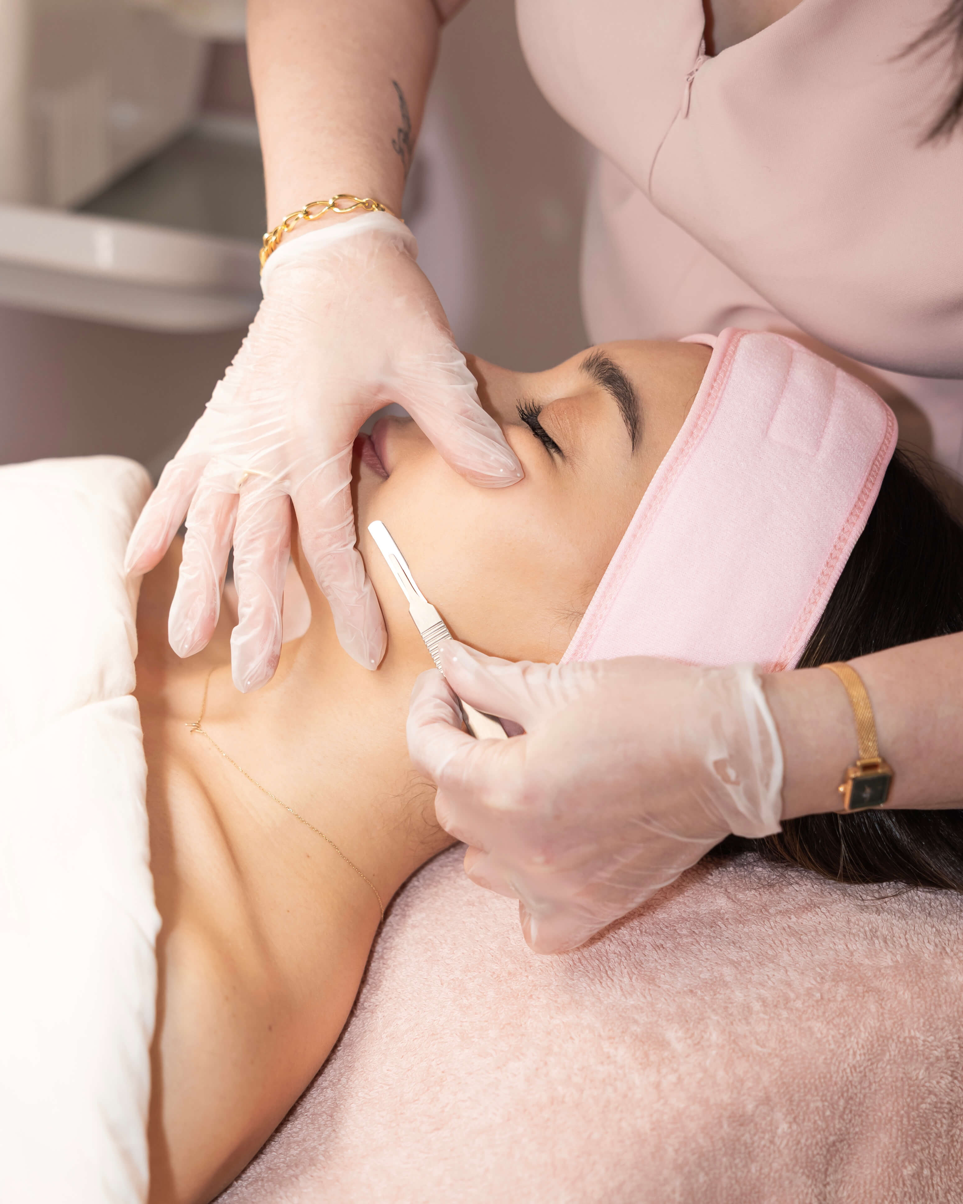 Our dermaplaning treatment uses a specialized surgical blade, expertly glided at a precise 45° angle, to gently exfoliate the skin. This process effectively removes dead skin cells, fine hair, and the topmost layer of congestion, unveiling fresh, vibrant skin underneath. The result is a complexion that feels luxuriously soft and looks radiant, with a renewed clarity and smoothness.